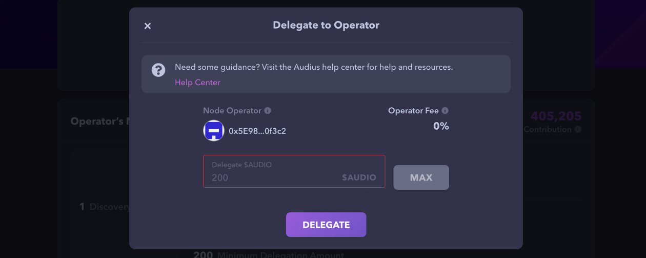 $AUDIO holders can delegate a minimum of 100 tokens to any Node Operator by connecting their wallet on the Audius Protocol Dashboard using Wallet Connect.