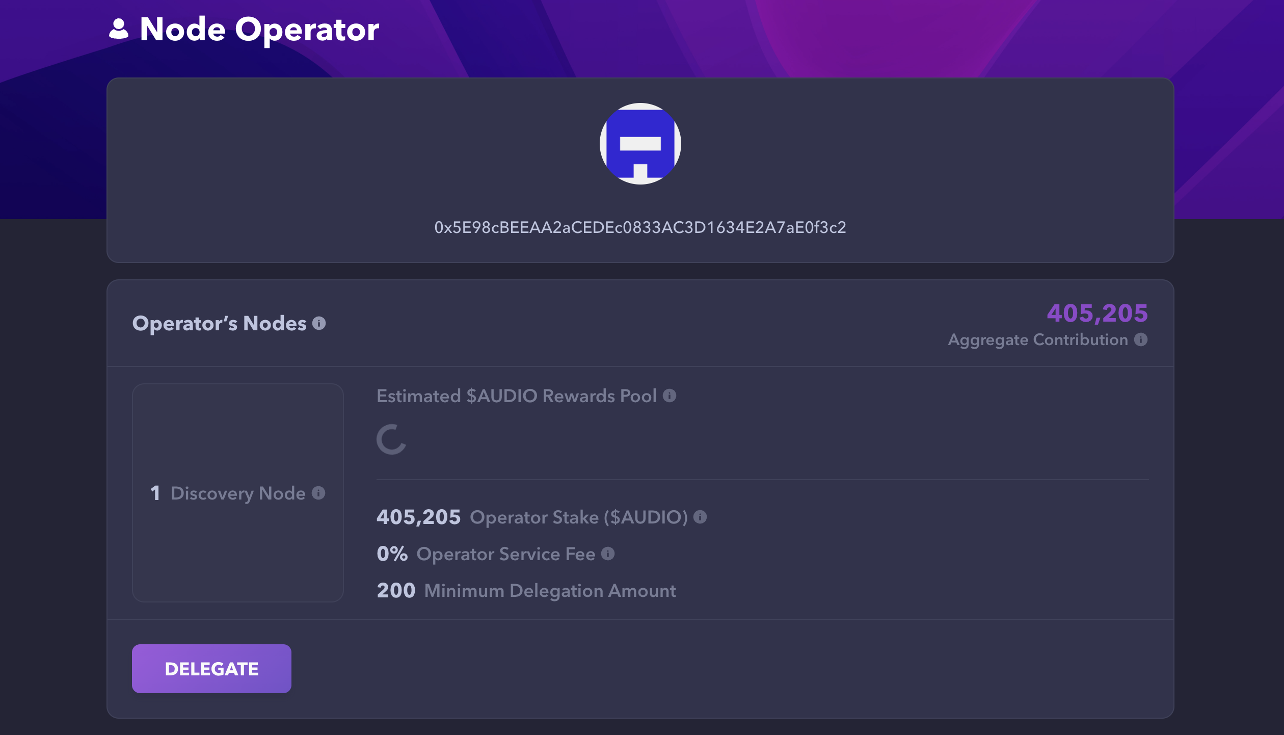 - Review the Node Operator information and enter the amount of $AUDIO to delegate, and click the "Delegate" button.
